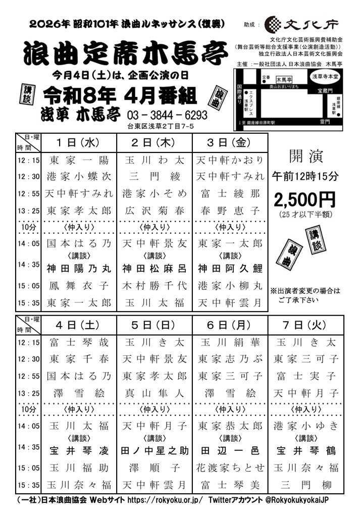 4月 2日「木馬亭定席」浅草木馬亭 12時15分〜 3日「第98回玉川太福”月例”木馬亭独演会」浅草木馬...