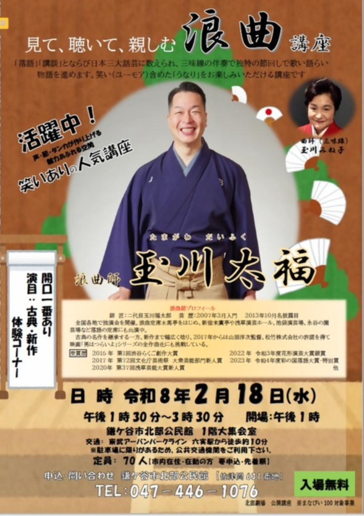 「玉川太福浪曲講座」13時30分開演 開場13時