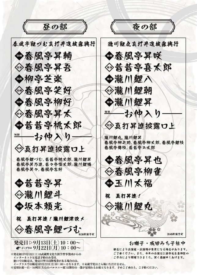 出演:春風亭昇咲、雀々亭喜太郎、瀧川鯉八、瀧川鯉朝、瀧川鯉昇、春風亭昇也、春風亭柳雀、玉川太福(曲師:伊丹明)、瀧川鯉丸 ※出演順