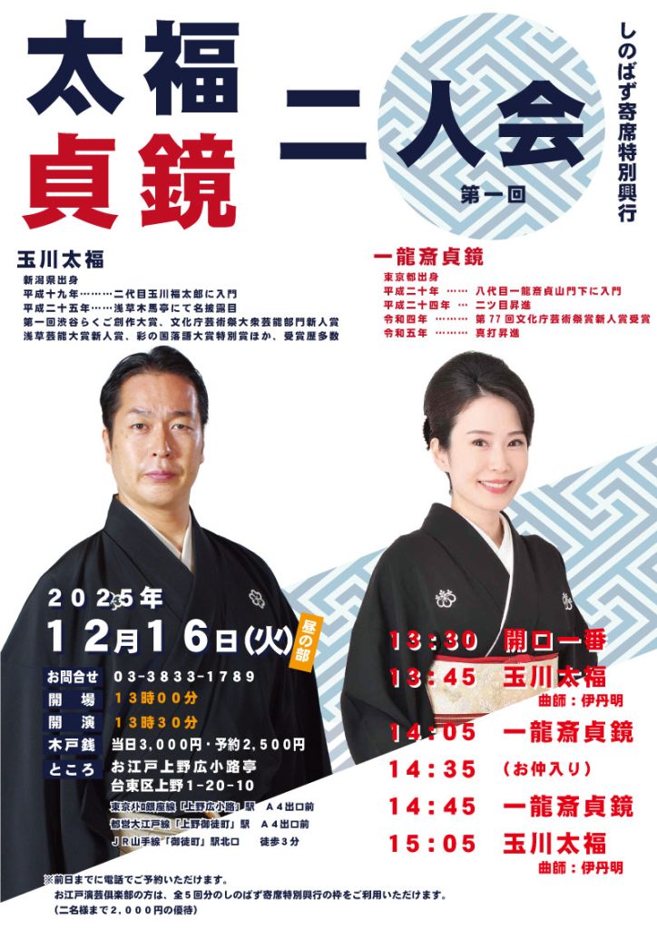 「しのばず寄席特別興行 玉川太福・一龍斎貞鏡二人会」13時30分開演 13時開場