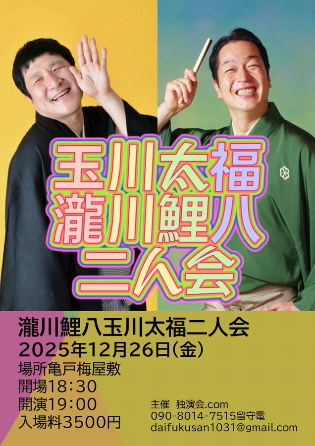 「瀧川鯉八・玉川太福 二人会」19時開演 18時30分開場