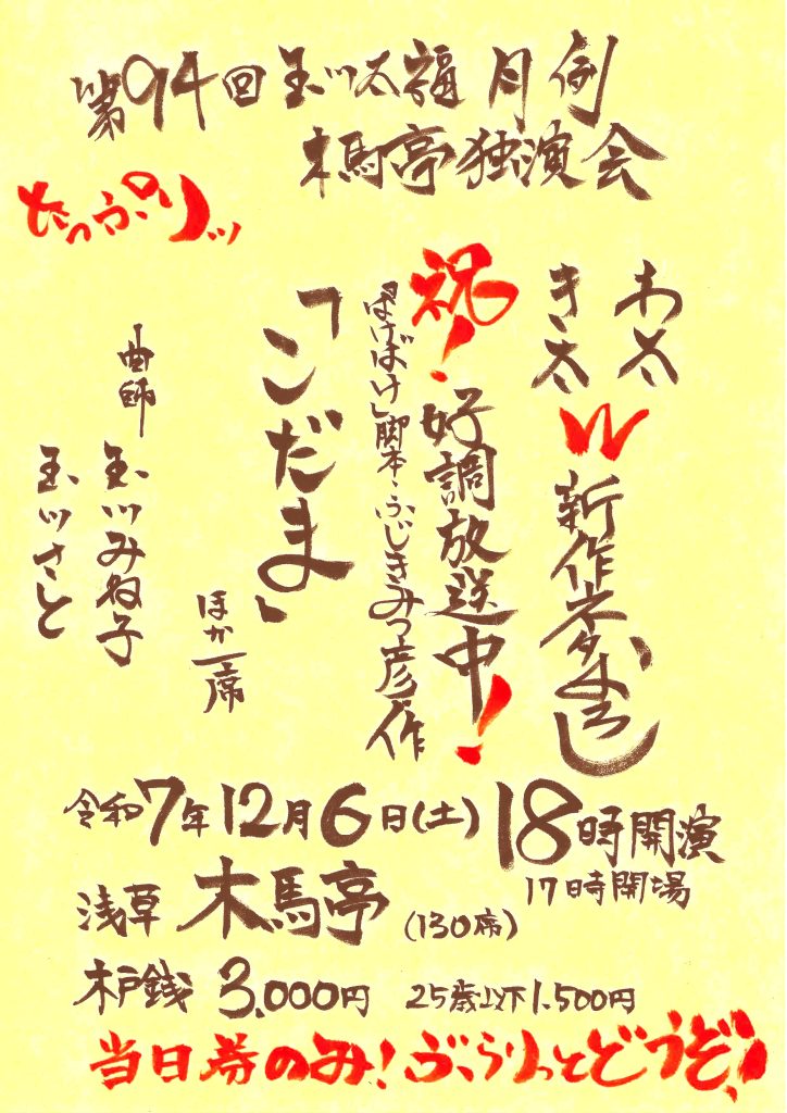 「第93回玉川太福”月例”木馬亭独演会」18時開演 17時開場